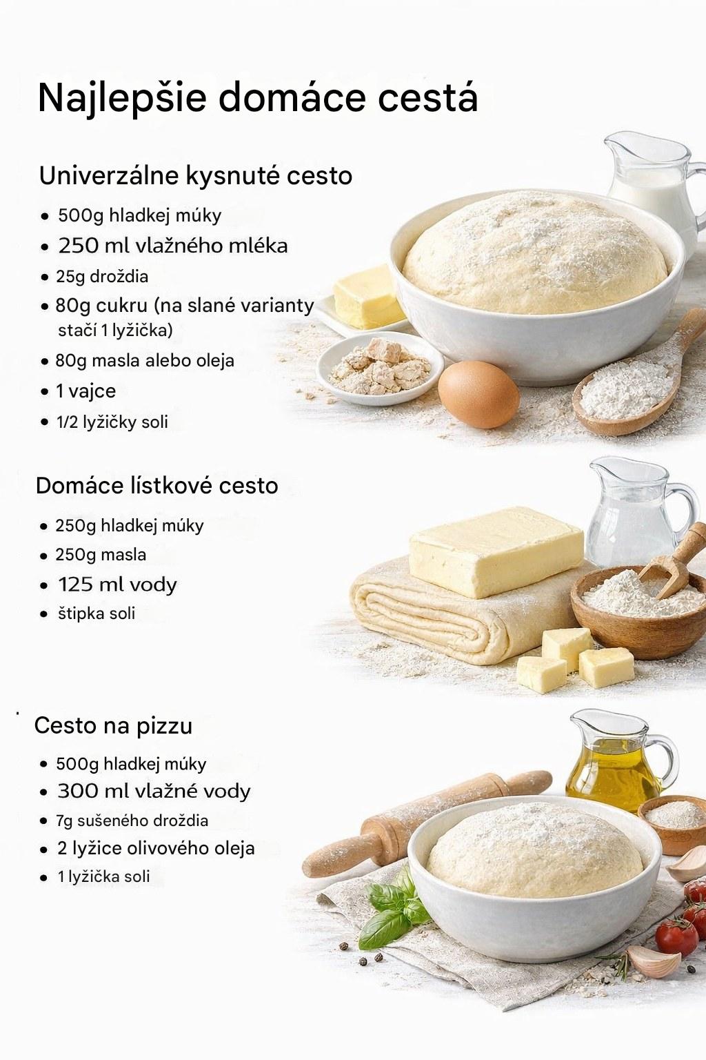 Z jedného univerzálneho kysnutého cesta upečiete buchty, koláče ale aj slané pečivo. Listové cesto je považované za náročnejšie ale v domácej verzii si ho môžete prispôsobiť a použiť napríklad na záviny, koláčiky alebo slané tyčinky. Cesto na pizzu je zase krásne chrumkavo po okrajoch a vláčne vo vnútri.