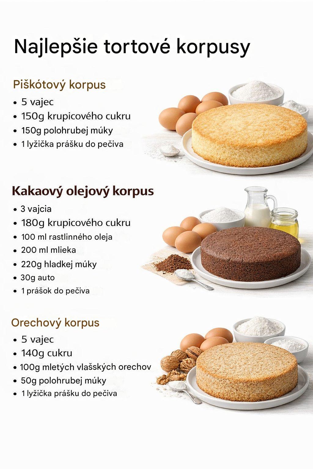V dnešnom článku si predstavíme recepty na najobľúbenejšie tortové korpusy, ktoré využijete pri príprave väčšiny klasických aj moderných dezertov. Všetky recepty sú do formy s veľkosťou 24 cm. Piškótový korpus sa hodí na ovocné a smotanové torty. Kakaový olejový korpus zase zaujme milovníkov čokolády a orechový korpus dodáva dezertom výraznú arómu.
