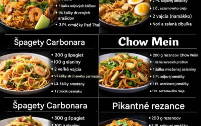 1. Sezamové rezance Ingrediencie • 225 g rezancov • 1/4 šálky sójovej omáčky • 2 PL sezamového oleja • 1…