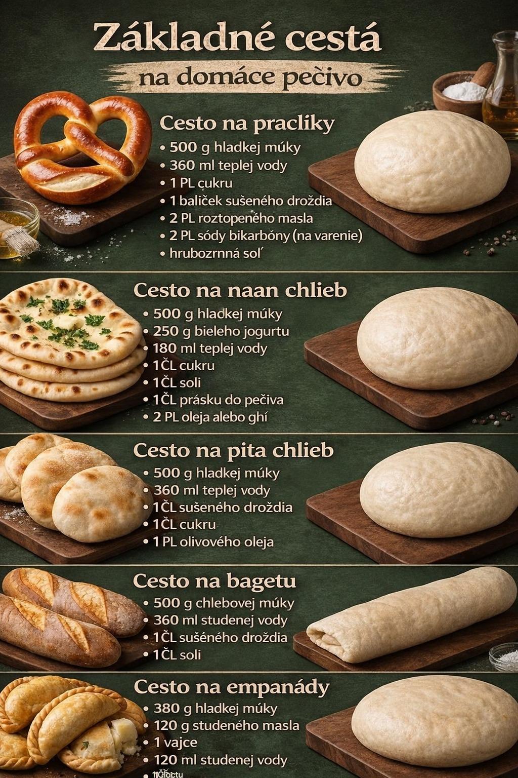 Domáce pečivo má nezameniteľnú chuť, vôňu a textúru, ktorú v obchode jednoducho nenájdete. Či už máte chuť na mäkké praclíky, nadýchaný naan, tradičný pita chlieb, chrumkavú bagetu alebo krehké empanády, základom úspechu je správne pripravené cesto. V tomto článku nájdete osvedčené recepty na najpoužívanejšie druhy cesta na domáce pečivo, prehľadne spracované, SEO-optimalizované a vhodné pre začiatočníkov aj pokročilých domácich pekárov.