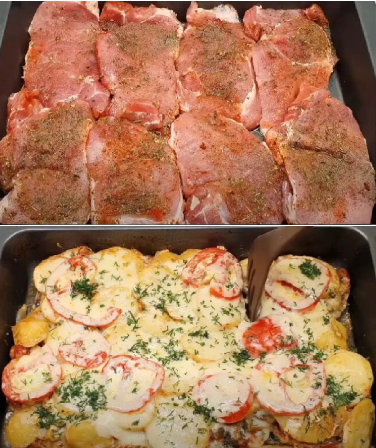 Lahodné zapekané mäso z jedného plechu. Jednoduchý a chutný nápad na rýchlu večeru.
