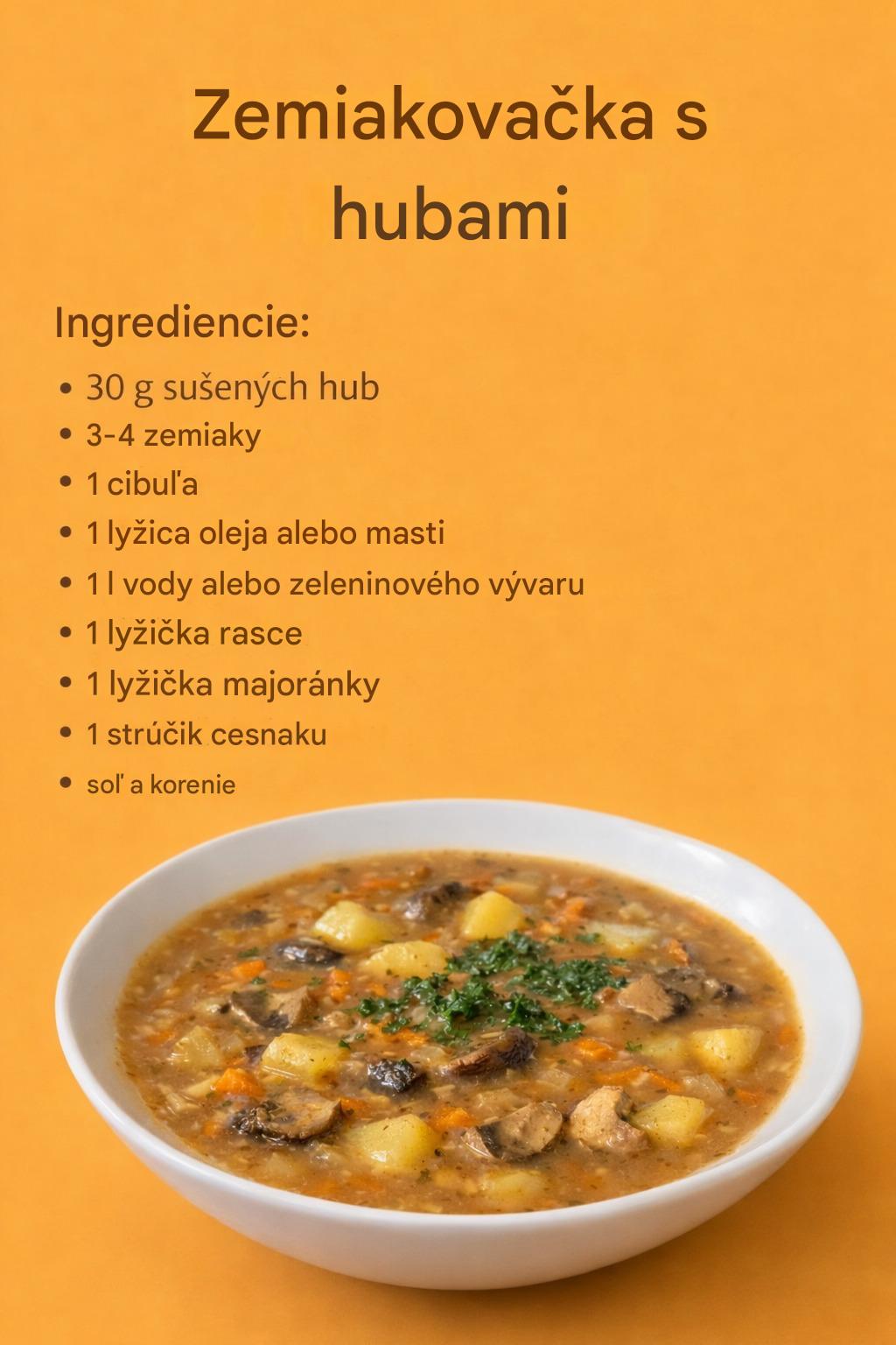 Zemiakovačka s hubami patrí k polievkam, ktoré má väčšina ľudí spojených s domácou kuchyňou. Každý ju pripravuje trochu inak. Niekto pridáva viac zeleniny a niekto ju zase necháva ľahšie a jednoduchšie. Hodí sa do chladných dní, kedy máte chuť na niečo sýte a teplé. Stačia vám základné suroviny, ktoré máte doma vo vašej kuchyni.