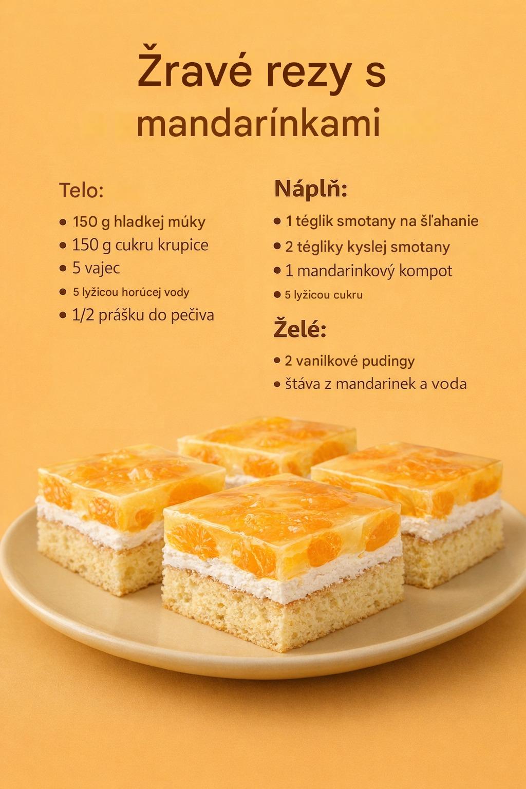 Žravé rezy s mandarínkami sú dezertom, ktorý sa hodí na každú príležitosť. Môžete ich pripraviť na slávnostné príležitosti, alebo len tak ako dezert k popoludňajšej šálke kávy. Kúzlo tohto dezertu spočíva v kombinácii nadýchaného piškótového korpusu, jemného smotanového krému a ľahkej pudingovej vrstvy na povrchu.